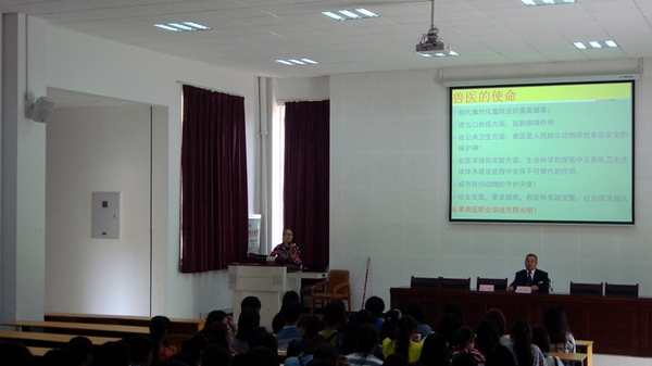 教研室王銳老師分層次從不同的角度以詳實的內容及豐富多彩的圖片對美麗小哨航空城、畜牧城、職教園區獨特的地理位置作了介紹、又飽含深情地向同學們訴說了云南農業職業技術學院古老而年輕的辦學歷程;驕傲而自豪地介紹畜牧獸醫學院和自始自終以“獸醫、獸醫永爭第一”為口號的獸醫專業群;末了,讓事實說話,對獸醫專業群的四大王牌專業-----獸醫專業、獸醫與獸藥專業、動物防疫與檢疫專業、寵物養護與疫病防治專業作了剖析,特別是按國際慣例對官方獸醫、執業獸醫、鄉村獸醫都一一作了說明。一樁樁、一件件鮮活的事例打動了同學們的心,同學們聽看《獸醫之歌》視頻引發了共鳴。