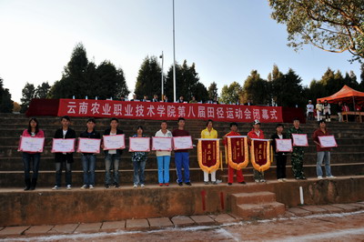 之后,本屆運動會裁判長董玉洲宣布了運動員個人比賽成績;俞浩副院長宣布了運動會集體獲獎名次。就坐在主席臺的領導為獲獎的集體和運動員代表頒發了錦旗、獎狀。