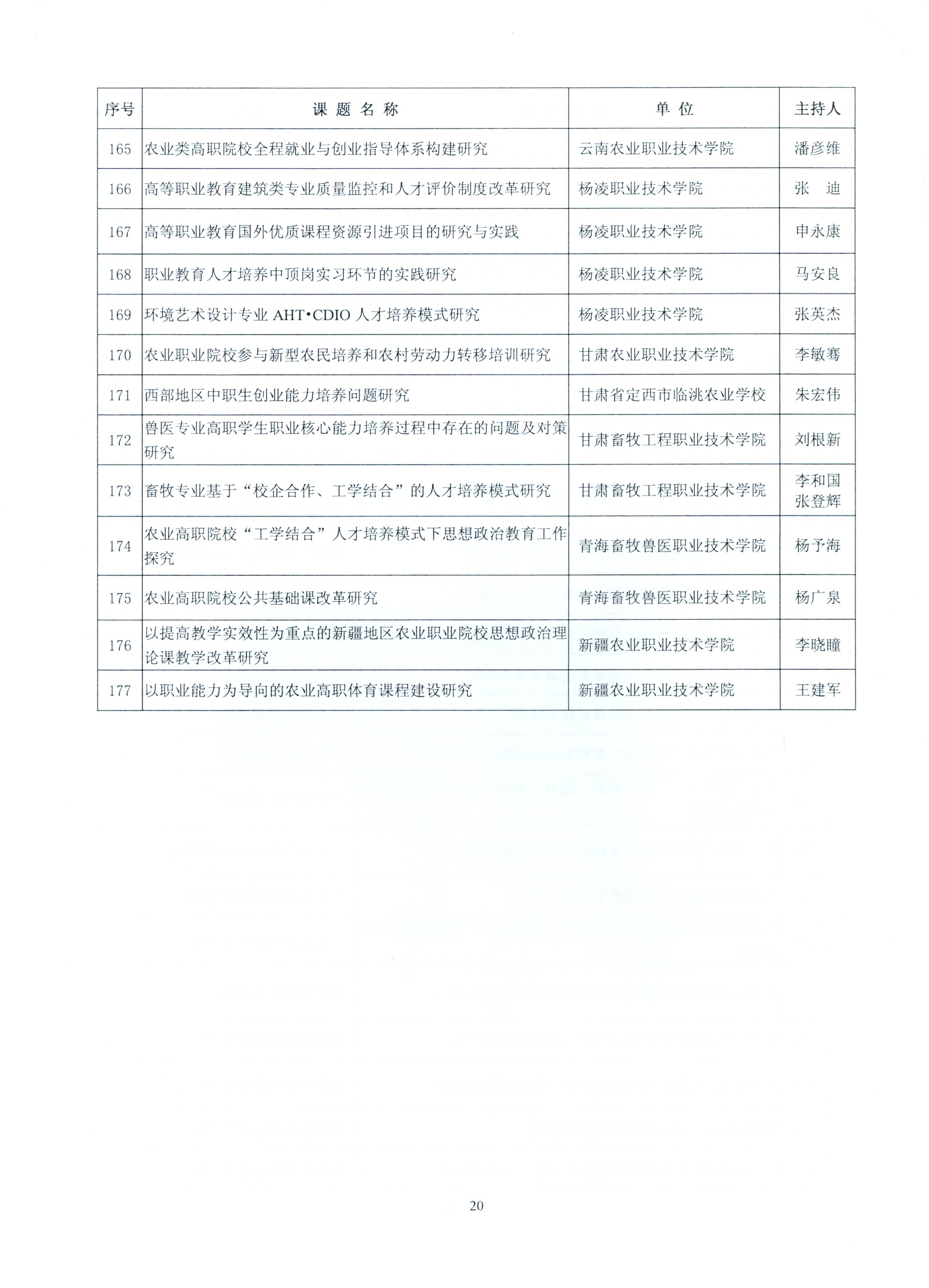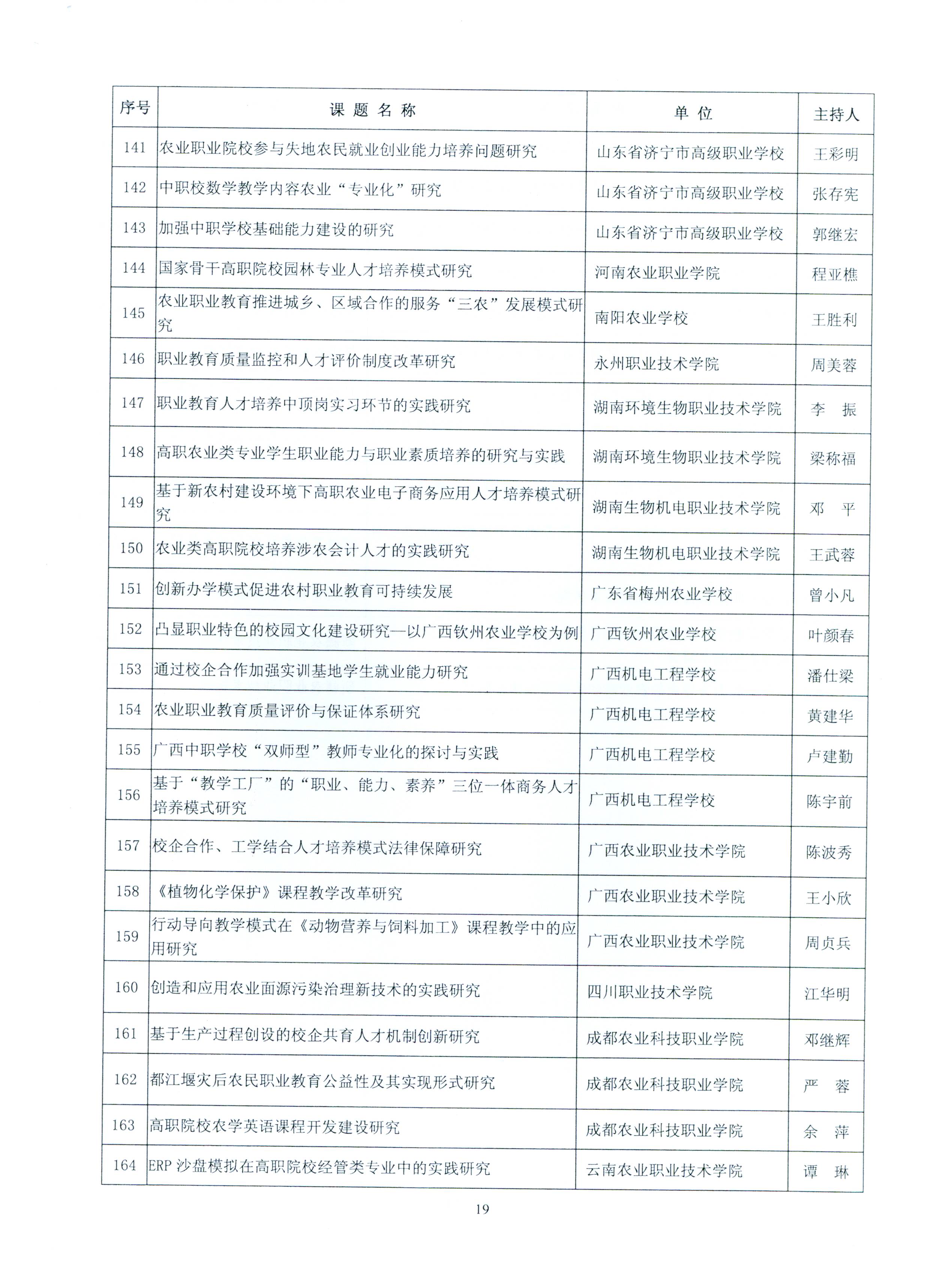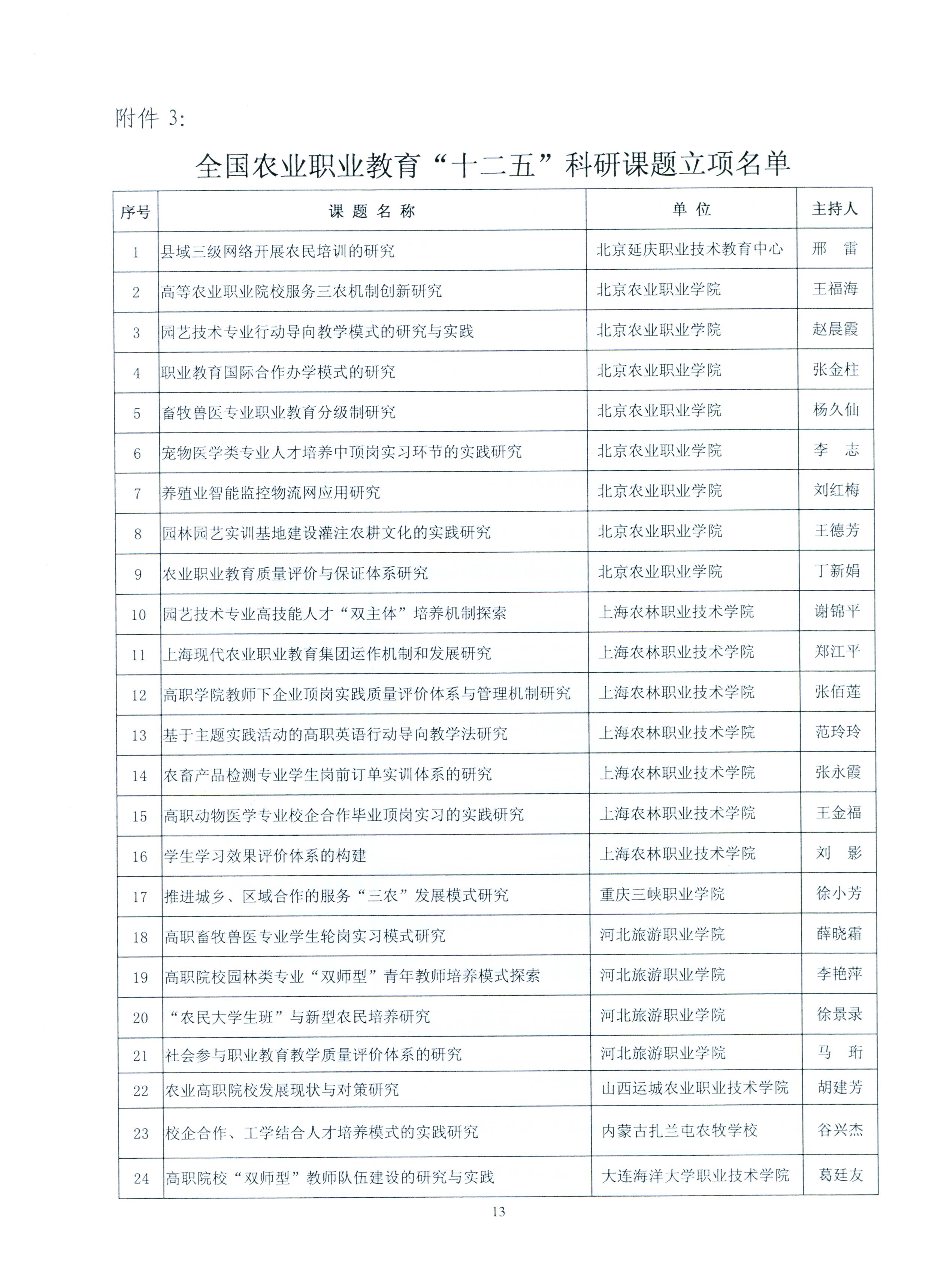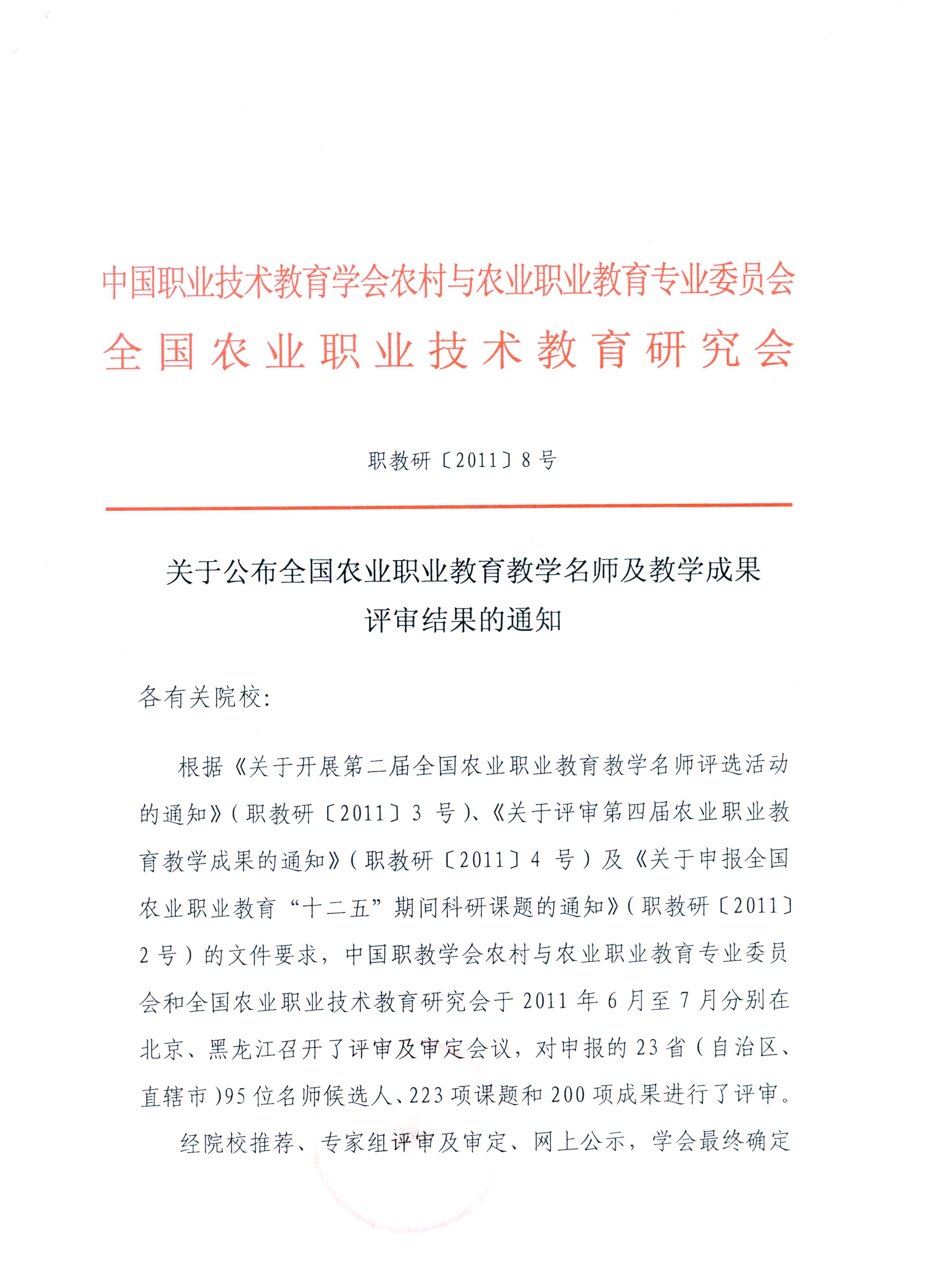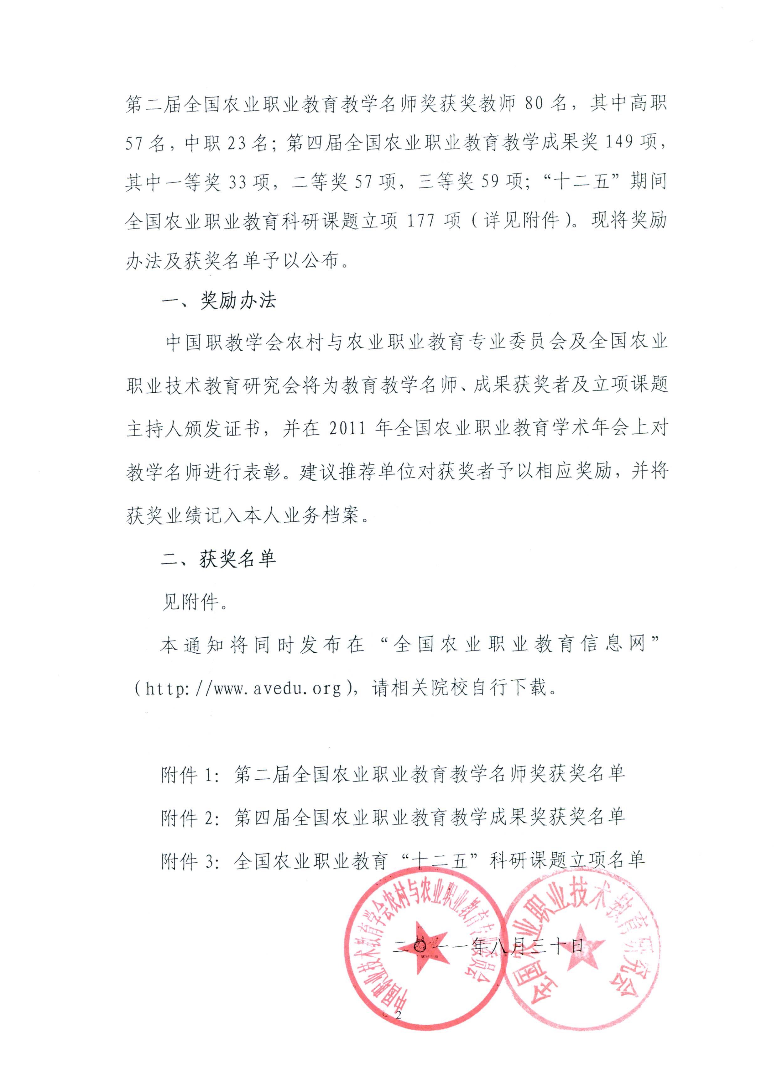 據(jù)中國(guó)職業(yè)技術(shù)教育學(xué)會(huì)農(nóng)村與農(nóng)業(yè)職業(yè)教育專(zhuān)業(yè)委員會(huì)全國(guó)農(nóng)業(yè)職業(yè)技術(shù)研究會(huì),《關(guān)于公布全國(guó)農(nóng)業(yè)職業(yè)教育教學(xué)名師及教學(xué)成果評(píng)審結(jié)果的通知》(職教研〔2011〕8號(hào))。中國(guó)職業(yè)技術(shù)教育學(xué)會(huì)農(nóng)村與農(nóng)業(yè)職業(yè)教育專(zhuān)業(yè)委員會(huì)于2011年6月至7月召開(kāi)評(píng)審及審定會(huì)議,最終確定“十二五”期間全國(guó)農(nóng)業(yè)職業(yè)教育科研課題立項(xiàng)177項(xiàng)。