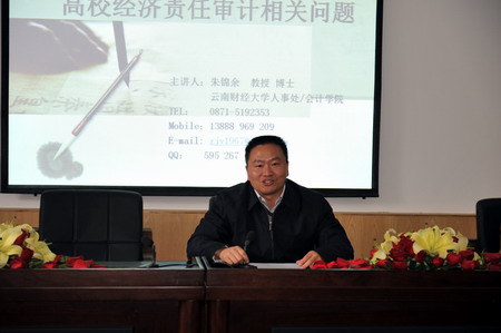 2011年11月9日下午,我院在茭菱校區報告廳舉行報告會,有幸邀請到云南財經大學朱錦余教授(博士生導師)給我院副科級及以上干部、計劃資產財務處工作人員等成功舉辦了“高校經濟責任審計相關問題”的精彩講座,彭志遠院長主持講座。