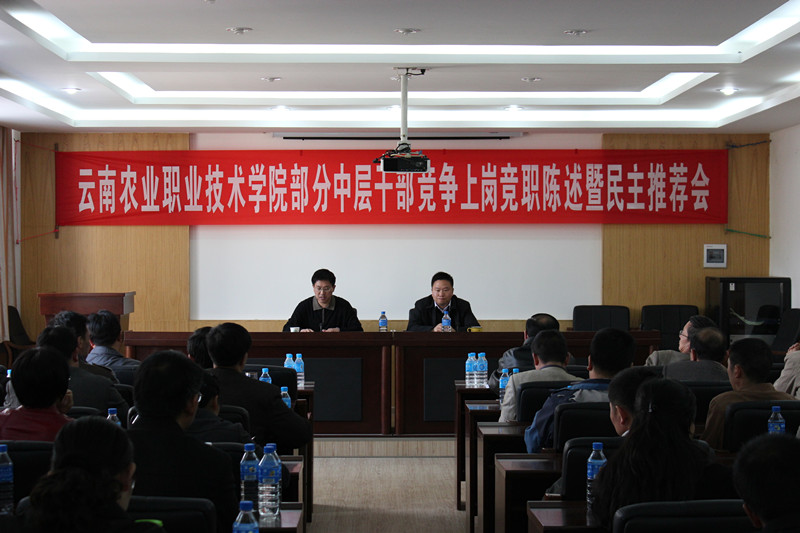 崔書記首先對(duì)競(jìng)聘崗位、競(jìng)聘程序等情況進(jìn)行了簡(jiǎn)要說(shuō)明。本次公開(kāi)競(jìng)職的崗位共有6個(gè):示范性院校建設(shè)辦公室主任、園藝與園林工程系副主任、生物工程系副主任、管理與信息工程系副主任;共青團(tuán)云南農(nóng)業(yè)職業(yè)技術(shù)學(xué)院委員會(huì)書記、思想政治理論教學(xué)部主任兩個(gè)職位因報(bào)名人數(shù)不足3人,不進(jìn)入此次競(jìng)職陳述程序。