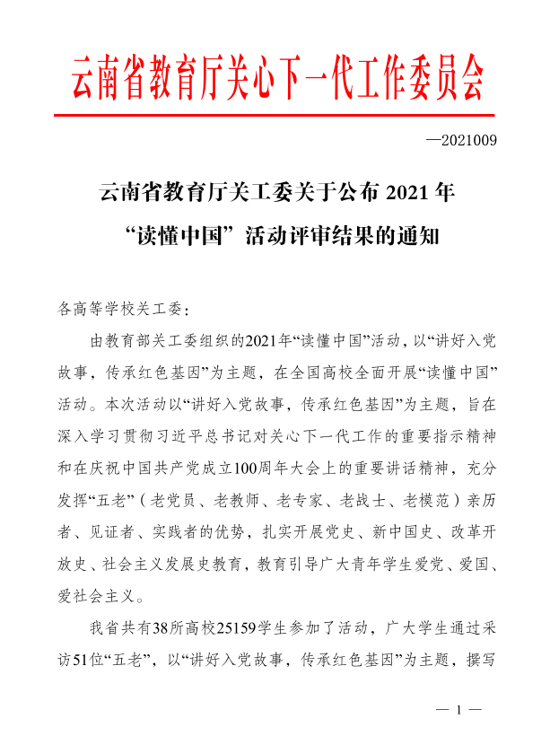 通知中心近日,云南省教育廳關工委公布了2021年“讀懂中國”活動評審結果。我院19園藝技術一班楊云微視頻作品《“讀懂中國—傳承紅色基因”》榮獲三等獎,19園林技術一班張璟征文作品《平凡行使命,家國在心中》、20畜牧獸醫(yī)五班林睿欣征文作品《與“五老”一同回首紅色記憶》分別榮獲三等獎,19財務管理六班靜本征文作品《手持接力棒,不負新時代》榮獲優(yōu)秀獎。