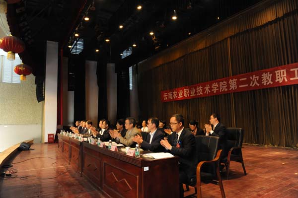 下午4:00,第二次全體會議在茭菱大禮堂召開。工作人員宣讀大會對《學院工作報告》、《學院財務工作報告》、《學院工會工作報告》、《云南農業職業技術學院章程(草案)》的決議草案。與會各代表對各決議草案分別進行了表決通過。何明東副院長表示,學校教職工代表以主人翁的地位,站在學校高度參加會議,并提出若干寶貴的意見和建議。雖然學校當前面臨各種客觀困難,學校基礎設施建設出現一些插曲,但相信學校的未來是美好的,學校的發展是不可逆轉的。學校將及時分類、梳理各位代表的意見和建議,形成擬辦意見交由分管領導牽頭,各職能部門認真研究解決。