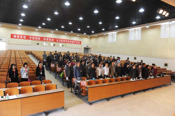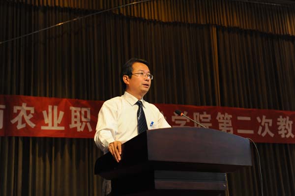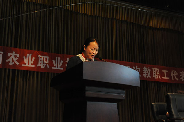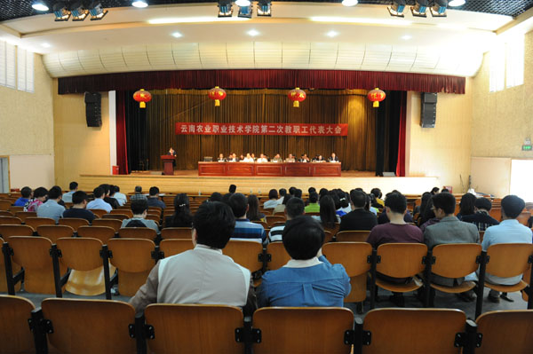莊嚴的《國歌》聲中,第二次教職工代表大會第一次全體會議9:00在茭菱校區大禮堂隆重開幕,省農業廳機關黨委專職副書記、工會主席王俊秀同志、教職工代表大會正式代表92人和特邀在職教職工代表和離退休老干部代表19人參加了會議。會議由何明東副院長主持。會上,省農業廳機關黨委專職副書記王俊秀同志發表講話。他首先對大會的召開表示祝賀;對學校為云南的“三農”工作及社會發展做出巨大貢獻表示肯定;他強調,學校的任務很艱巨,相信農職學院會發展得更好,農職學院的明天更美好!學院黨委書記崔金賦同志致辭。崔書記表示,學校教職工代表大會是教職工依法參與學校民主管理和監督的基本形式。在學校全面深化內涵特色建設的關鍵時刻,我們召開云南農業職業技術學院第二次教職工代表大會,目的是動員廣大教職工統一思想,認清形勢,集思廣益,凝心聚力,共同推動學校實現新的發展。這是學校推進依法治校的重大舉措,是學校改革發展的重大事件。他強調,來自學校各個部門、不同層面的近101名教職工代表,肩負著全校職工的重托,匯聚一堂,共商大計。希望大家以高度的責任心和強烈的使命感,認真履行教職工代表的神圣職責,主動為學校的改革發展獻計獻策,積極代表和維護廣大教職工的合法權益,努力將這次大會開成解放思想、開拓創新的大會,發揚民主、集思廣益的大會,凝心聚力、團結奮進的大會。校長李永忠同志向大會作了《學院工作報告》;黨委副書記、紀委書記、工會主席趙剛同志向大會作了《工會工作報告》;計劃資產財務處處長程春慧同志向大會作了《學院財務工作報告》;黨委辦公室(院長辦公室)主任金吉斌同志向大會作了《學院章程起草情況的說明》。