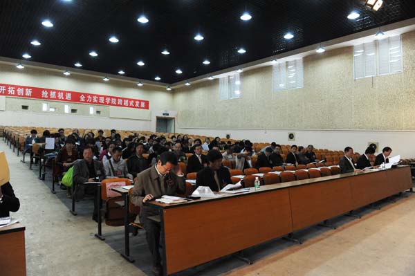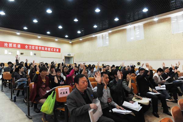 第一次全體會議結束后,各正式代表和特邀代表中的在職教職工同志,按照指定地點參加了分組討論。下午4:00,大會主席團聽取了各組匯報各位代表的討論意見,討論通過關于《學院工作報告》、《工會工作報告》、《學院財務工作報告》和學院章程草案的決議草案。