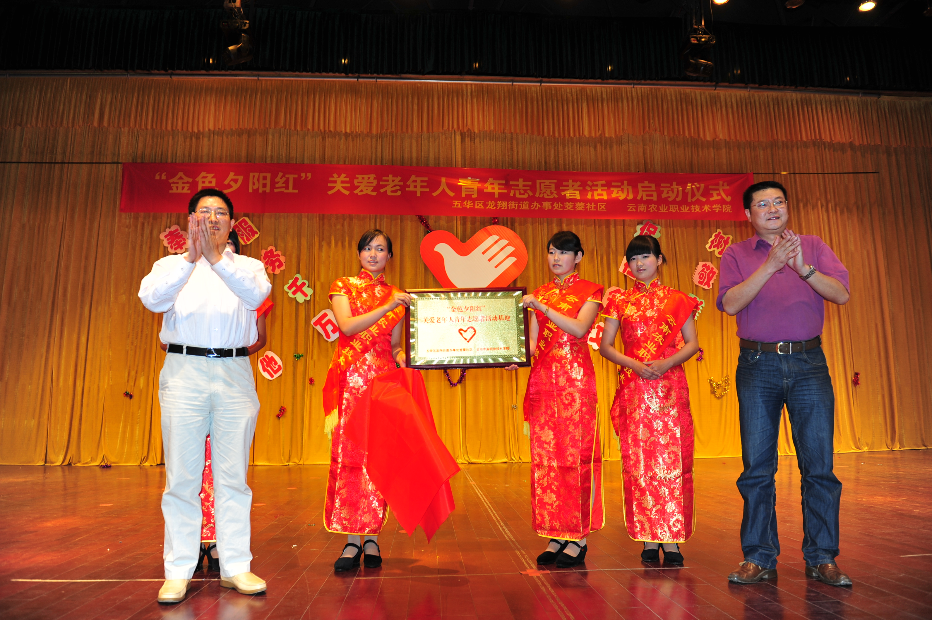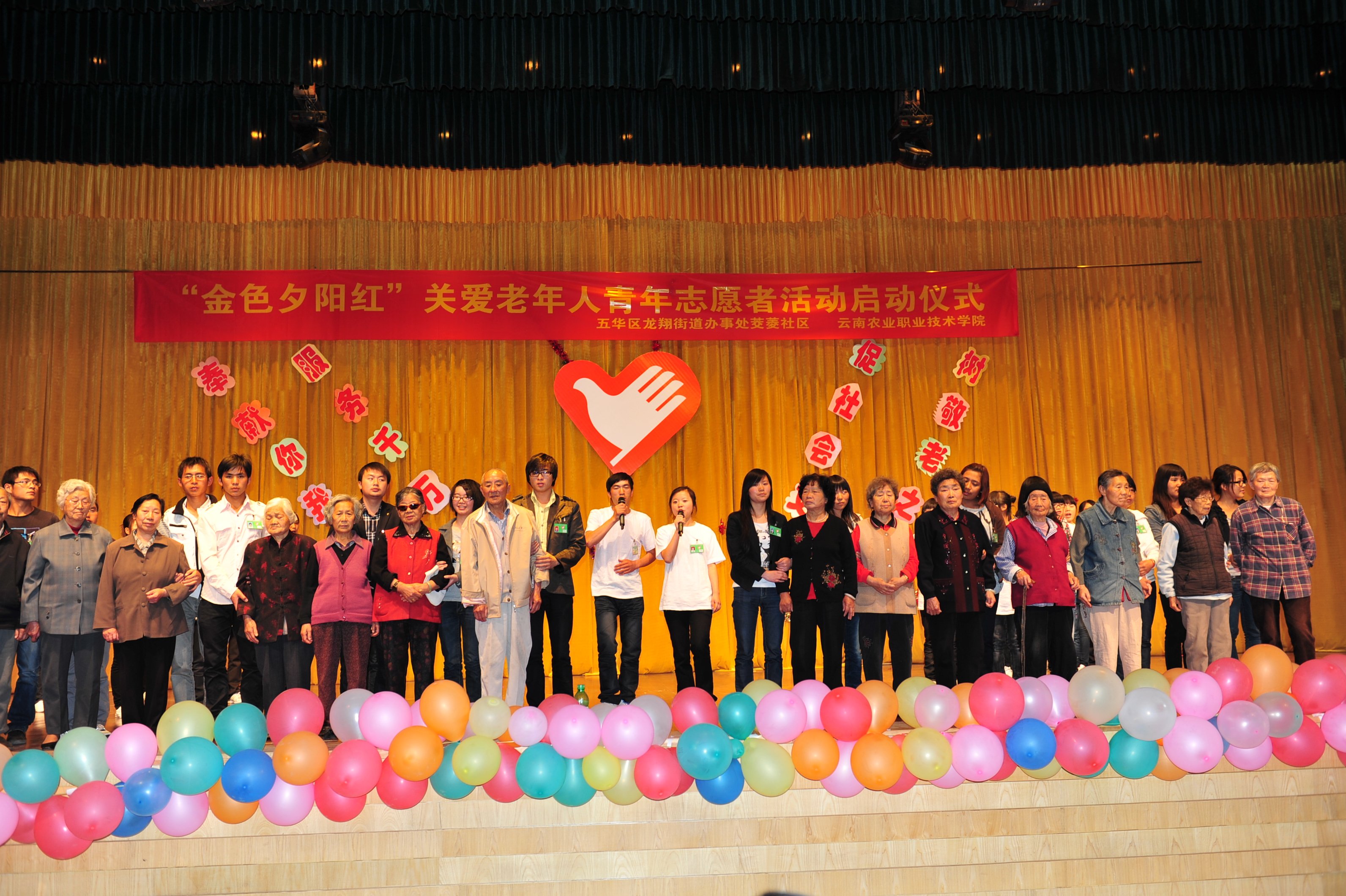 2011年5月5日下午1:00,五華區龍翔街道辦事處“金色夕陽紅”關愛老年人青年志愿者活動啟動儀式在我院茭菱校區禮堂隆重舉行。此次活動由云南農業職業技術學院黨委宣傳部、共青團云南農業職業技術學院委員會與五華區龍翔街道辦事處茭菱社區聯合舉辦。學院黨委書記崔金賦、黨委宣傳部馮志宏部長、學生工作處周誠處長、學院團委書記鞏佳老師,五華區龍翔街道辦事處及茭菱社區的領導出席了啟動儀式,茭菱社區的70位老人及我院的青年志愿者參加此次啟動儀式。