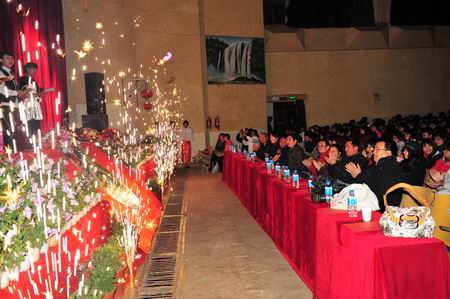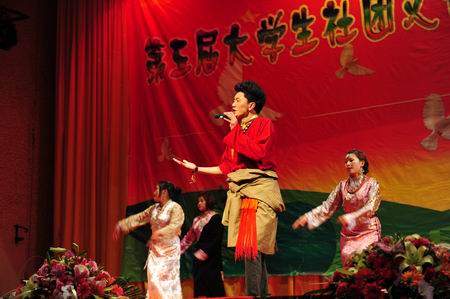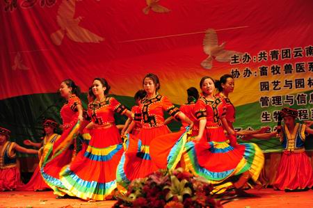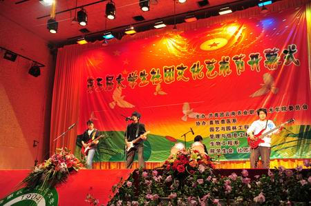 宣傳部部長(zhǎng)馮志宏向藝術(shù)節(jié)致賀詞,學(xué)生工作處處長(zhǎng)周誠宣布學(xué)院大學(xué)生藝術(shù)節(jié)開幕!隨著Z·T樂隊(duì)《還我蔚藍(lán)》開場(chǎng)樂的奏響,社團(tuán)文化藝術(shù)節(jié)在激昂的音樂聲中拉開了序幕。藏族同胞一曲《潔白的哈達(dá)》仿佛把我們帶到了萬里以外的青藏高原,領(lǐng)略了那份豁達(dá)的高原情結(jié);相聲《說醫(yī)學(xué)》更是將會(huì)場(chǎng)氣氛帶到了高潮,一浪高過一浪的笑聲便是對(duì)表演同學(xué)的贊賞;一曲《天亮了》哀傷的曲調(diào)又將會(huì)場(chǎng)氣氛拉進(jìn)低谷......熱烈的喝彩和掌聲在會(huì)場(chǎng)此起彼伏,學(xué)生們的多才多藝在這里得到充分的發(fā)揮和展示。隨著《七月火把節(jié)》舞步樂曲的終止,社團(tuán)文化藝術(shù)節(jié)開幕式晚會(huì)帷幕徐徐落下。