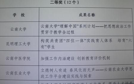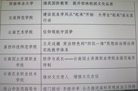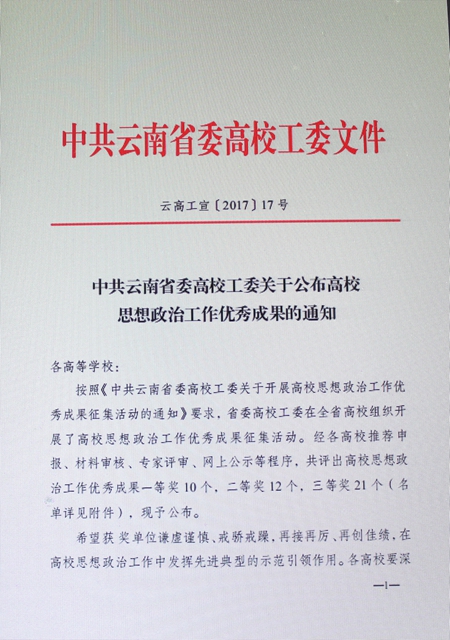 通知中心按照《中共云南省委高校工委關于開展高校思想政治工作優秀成果征集活動的通知》要求,省委高校工委在全省高校組織開展了高校思想政治工作優秀成果征集活動。我院積極參與,以《推動文化育人 增強文化自信》為題的成績在高校思想政治工作優秀成果中榮獲二等獎。