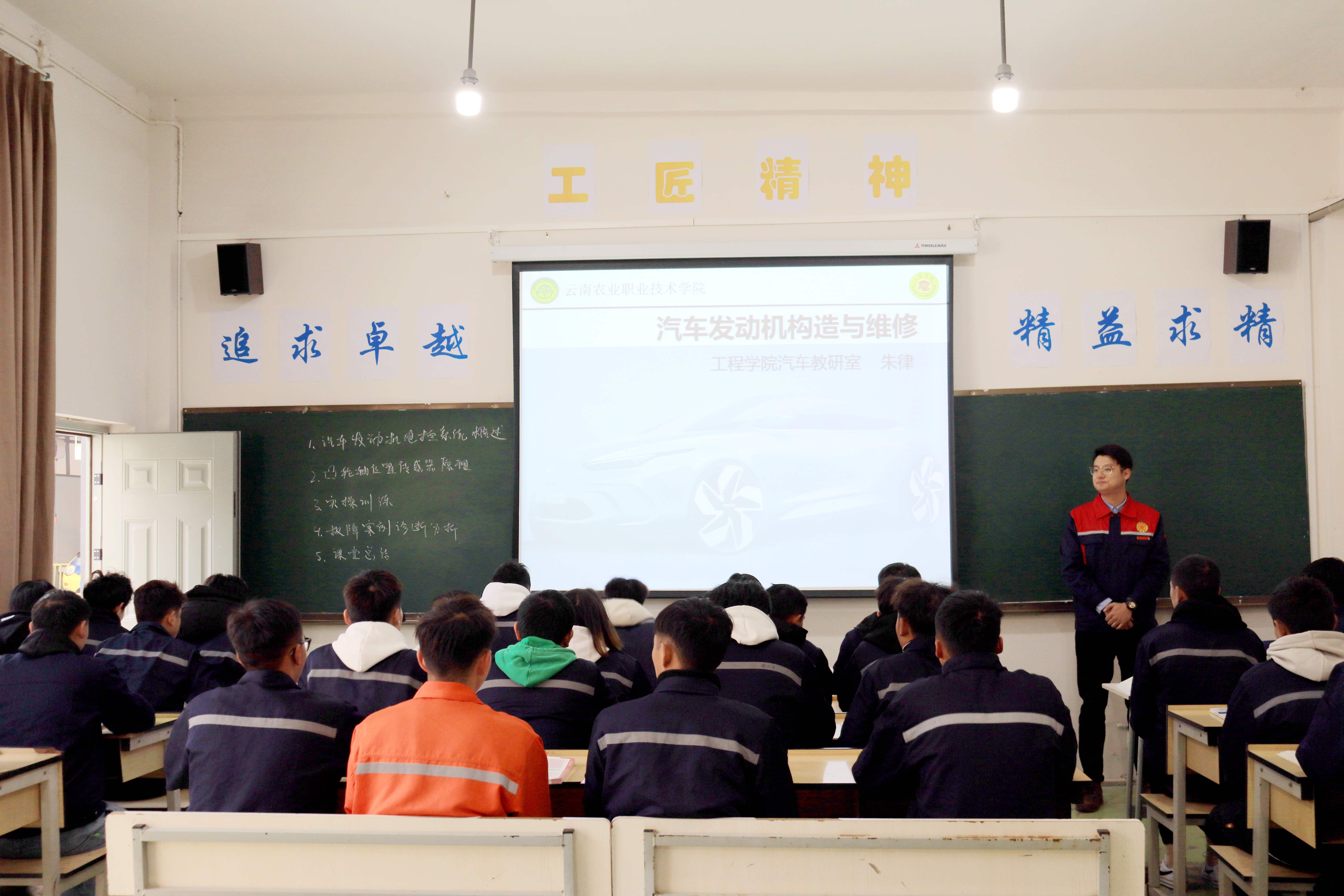 會前,參會領導和教師一起觀摩學習了工程學院汽車專業的朱律老師和20級汽修一班的同學們共同呈現的“課程思政”示范課展示。