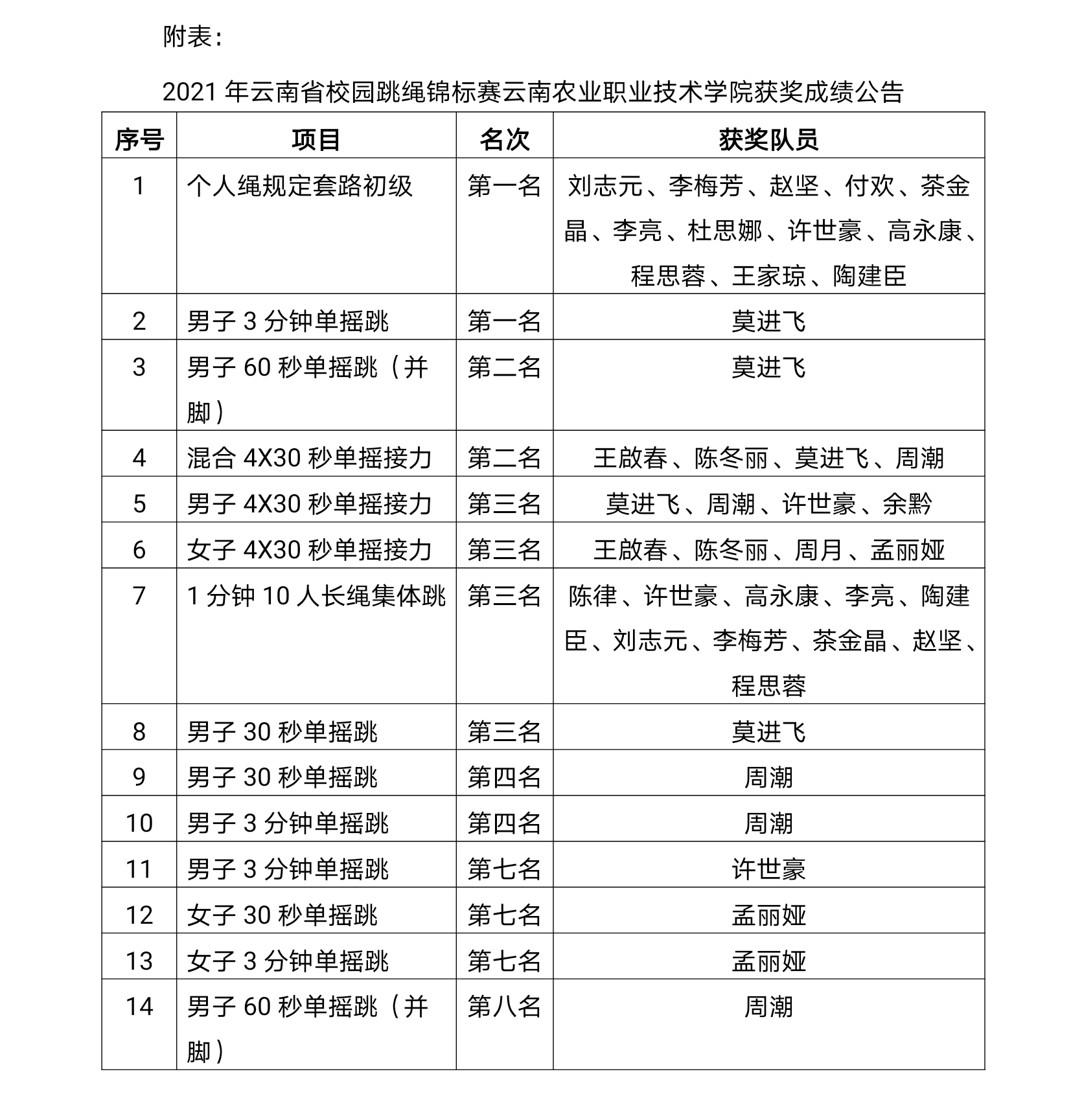 通知中心為進一步推動我省校園跳繩運動發展,提高校園跳繩運動技術水平,12月20日,由云南省教育廳舉辦的2021年云南省校園跳繩錦標賽拉開帷幕。在學院領導的大力支持下,我院跳繩隊在教練員排木用老師的帶領下積極備戰、不畏困難,敢打敢拼,20名隊員在跳繩單項和集體項目均獲得了驕人的成績,排木用老師榮獲“優秀教練員”稱號,隊員獲獎名次詳見附表。