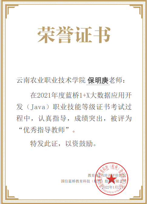 本次考試由互聯網技術學院保明庚老師作為主要負責人,他積極認真指導學生備考,夙興夜寐,力求學生能熟練掌握所有考點。在保老師事無巨細的認真指導下,學生過關斬將,最終喜獲佳績,獲得考試評價組織高度肯定和贊譽,并授予“優秀指導教師”稱號。