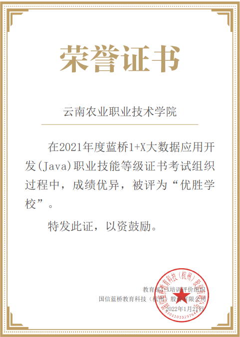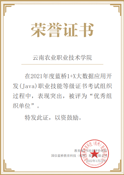 在2021年度1+x考試過程中,互聯網技術學院在藍橋1+x大數據應用開發(Java)職業技能等級證書考試中,一往無前,成績斐然,喜獲“優勝學校”榮譽證書。
